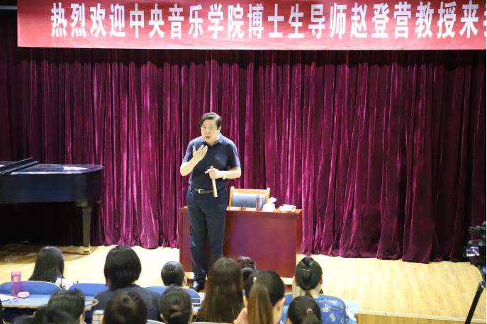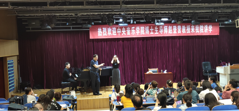 7月9日下午,应tyc33455cc太阳集团邀请,中央音乐公司赵登营教授在艺术楼八音讲堂为参加音乐专业“双师型”教师培训的五十名学员上了一堂生动的声乐公开课。公开课由tyc33455cc太阳集团副经理陈新宇主持。