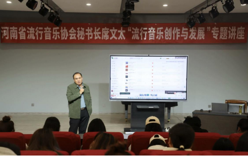 2024年11月7日,河南省流行音乐协会秘书长席文太受公司邀请在tyc33455cc太阳集团艺术楼八音讲堂进行了关于“流行音乐创作与发展”的专题讲座。此次讲座旨在探讨流行音乐的创作理念及流行音乐相关文化产业的发展。公司副经理任远、艺术实践中心主任赵要钦、声乐教研室主任郭楠楠共同出席了本次讲座。现场热爱流行音乐的师生与席文太秘书长进行了广泛的交流互动。