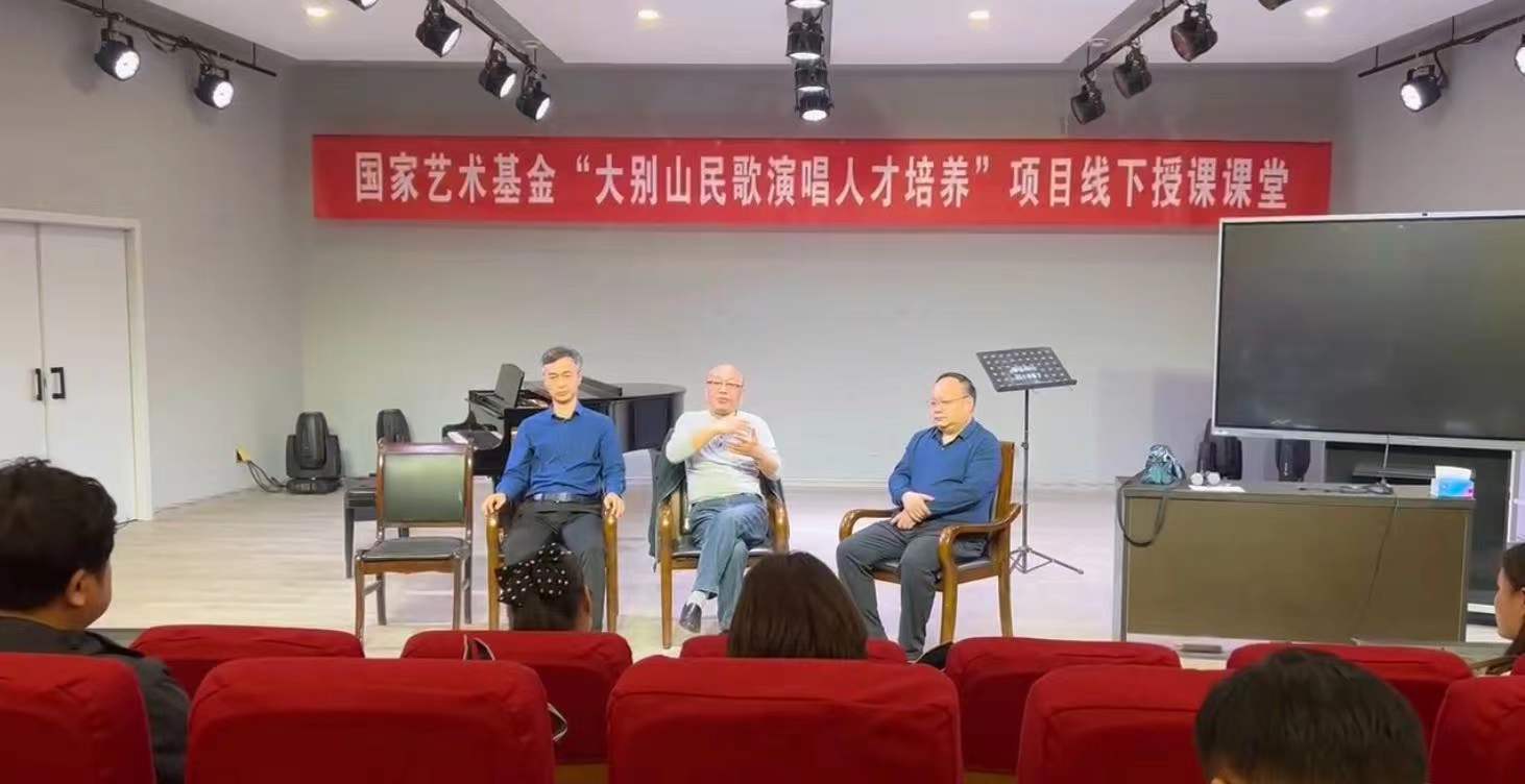 3月15日晚上,国家艺术基金“大别山民歌演唱人才培养”项目第二次研讨会在公司艺术楼107八音讲堂召开,出席会议的有合作方艺术总监刘宏奎主席,tyc33455cc太阳集团陈新宇经理,任远副经理,项目主持人韩冰老师以及公司青年教师等。