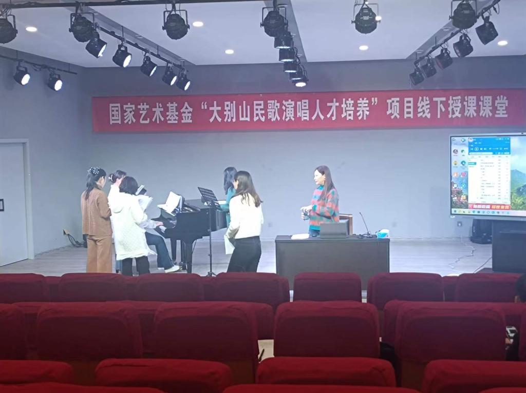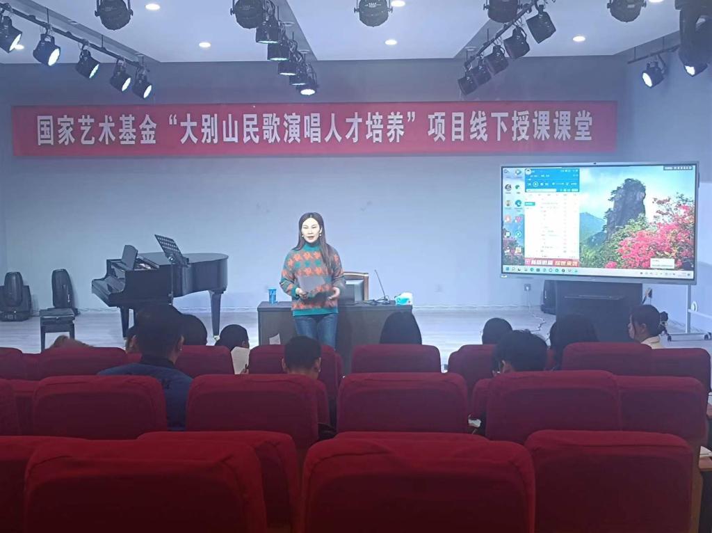 3月15日上午,国家艺术基金“大别山民歌演唱人才培养”线下授课课堂在公司tyc33455cc太阳集团一楼八音讲堂火热进行中。信阳民歌歌唱家,大别山民歌传承人,信阳市民歌研究会副主席李鸣凤应公司邀,以《豫南小调(一)》为题进行线下教学。