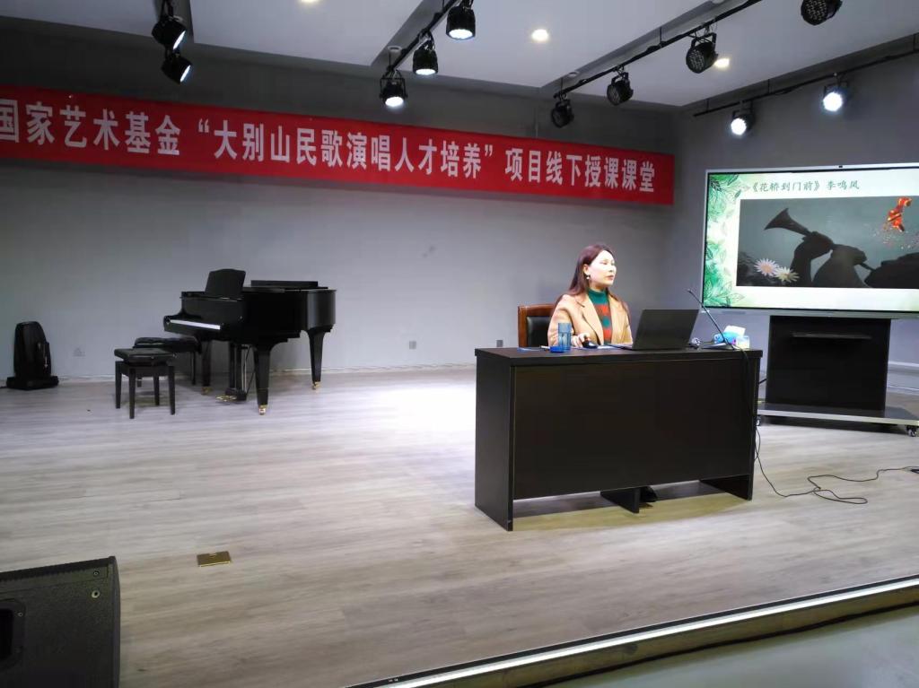 3月18日上午,国家艺术基金“大别山民歌演唱人才培养”线下授课课堂在公司tyc33455cc太阳集团一楼八音讲堂如期进行。大别山民歌传承人,信阳市民歌研究会副主席李鸣凤应公司邀请,以《豫南叙事歌》为题进行线下教学。