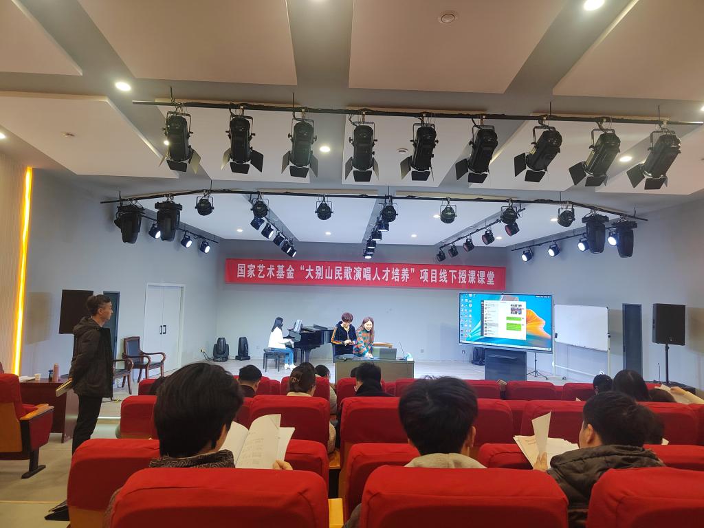 3月18日下午,国家艺术基金“大别山民歌演唱人才培养”线下授课课堂在公司tyc33455cc太阳集团一楼八音讲堂如期进行。大别山民歌传承人,信阳市民歌研究会副主席李鸣凤老师应公司邀请,为学员授课,参与实践课的还有韩冰副教授和张梦晗老师。