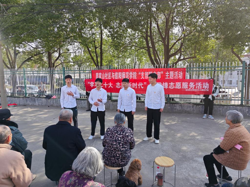 志愿者带着精心准备的节目到达周家山社区开展慰问演出,并与到场的老年朋友们进行亲切交流。演出在娓娓动听的小合唱中拉开帷幕,现场气氛热烈,观众热情高涨。最后全体演职人员与老人一起合唱《学习雷锋好榜样》《没有共产党就没有新中国》等经典红歌。