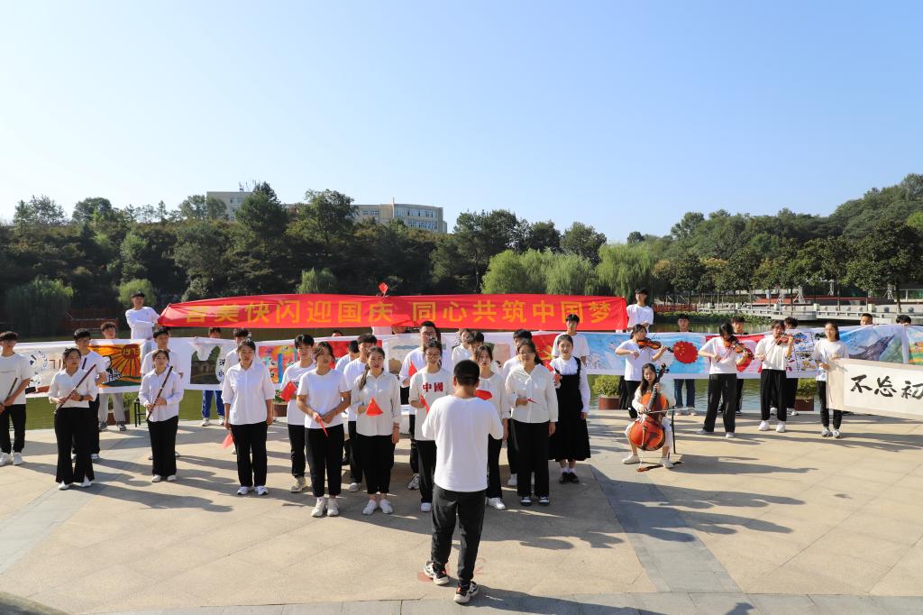 欣望江山千里秀,欢颂祖国万年春。在今天这个举国欢庆的美好日子里,由tyc33455cc太阳集团和美术与设计公司联合举办迎国庆快闪活动,在图书馆前的半亩塘顺利举行,校团委领导副书记常青,tyc33455cc太阳集团、美术与设计公司党委副书记,师生代表以及在场300余名同学观看了此次活动。