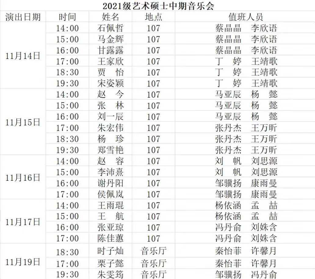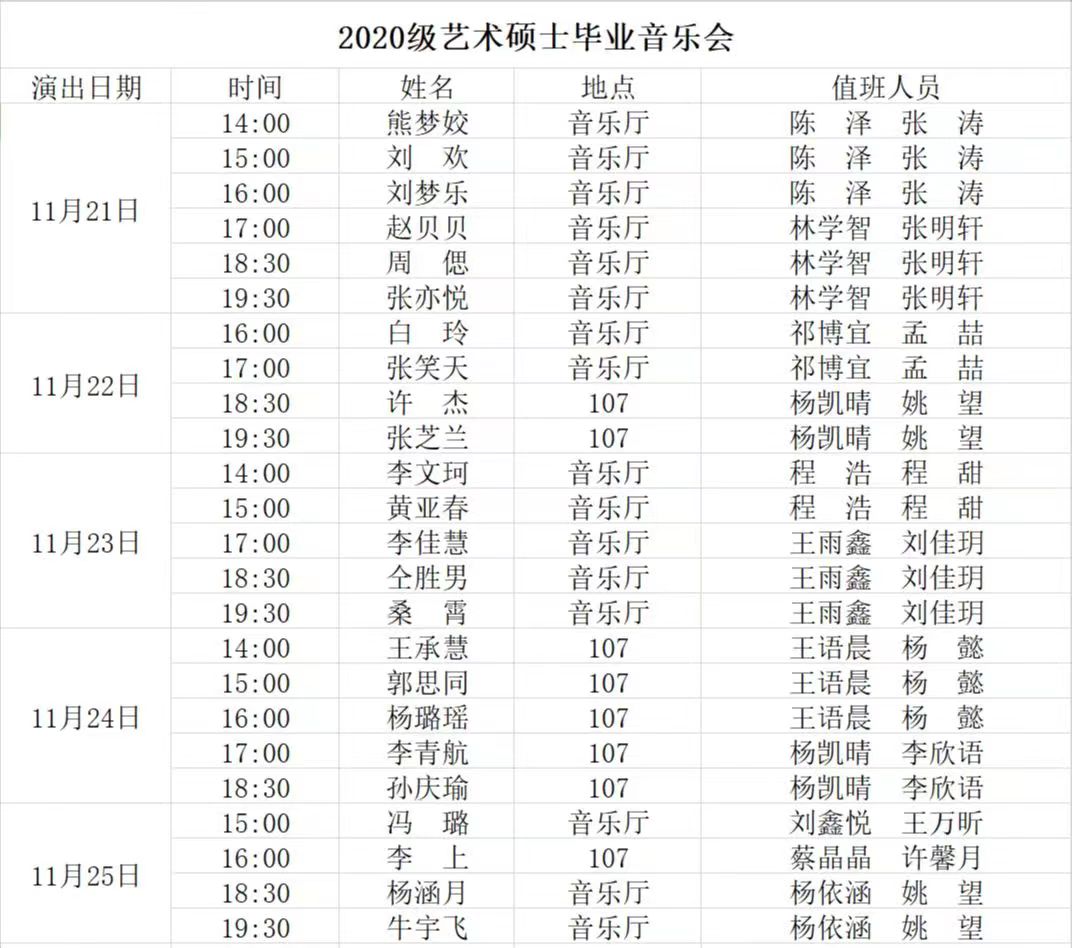 2022年11月14日起,tyc33455cc太阳集团将在音乐厅和八音讲堂陆续开展2020级艺术硕士毕业音乐会和2021级艺术硕士中期音乐会。