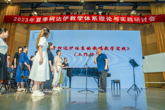 最后,梁洪来以工作坊形式开展《基于柯达伊体系的歌唱教学实践》,工作坊以匈牙利曲调模唱开始,逐渐展开多声部训练。使参会教师体验柯达伊教学法对旋律感知、内心听觉、记忆、调式判断、多声部歌唱、音乐表现力等多种能力的培养途径与方法。