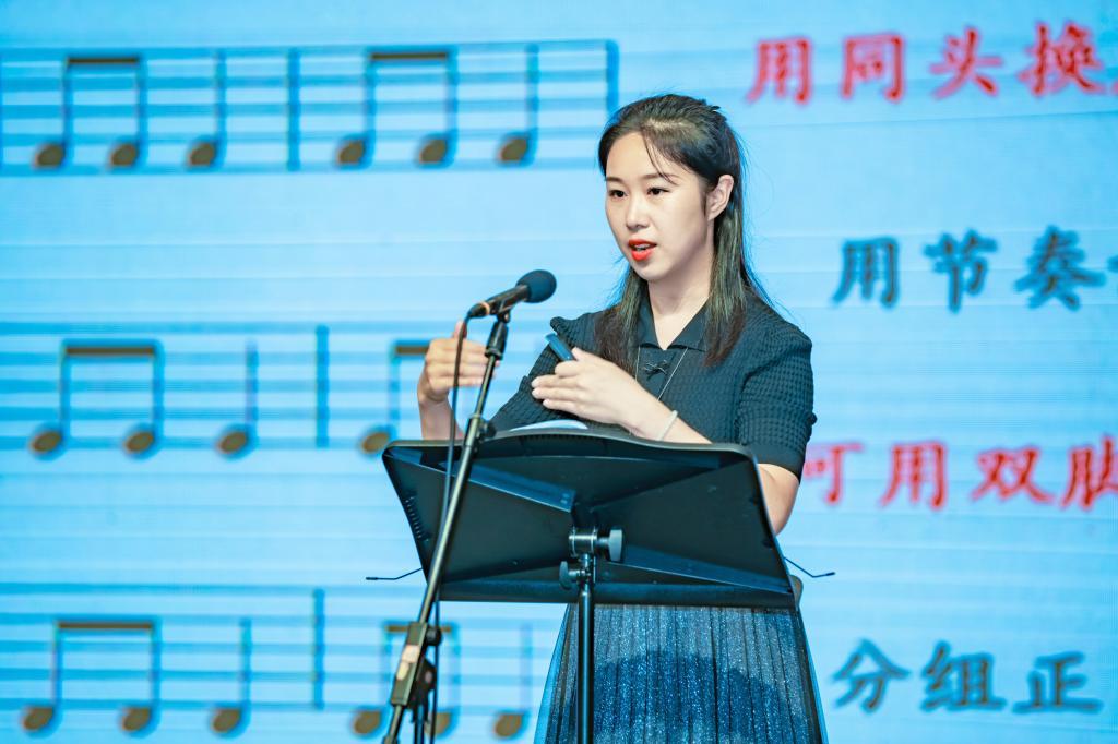 上午最后,由公司张思老师接续前程,继续带领参会教师进行柯达伊教学法之下视唱练耳的体验和练习。张思老师以柯达伊《333首读谱练习》为例,用分句练习、头尾互换创编、手脚辅助配合和正、逆反打等形式帮助参会教师强化节奏稳定性。唱名与节奏读法交替演唱,变化旋律演唱和多声部创编等形式练习,帮助参会教师更加准确的歌唱。参会教师们的学习热情高涨,积极互动,现场氛围融洽活跃。
