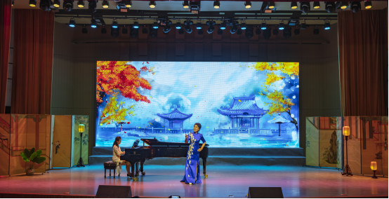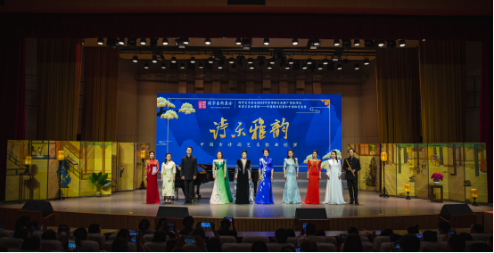 音乐会以“诗乐雅韵”为主题,巧妙地将中国古典诗词与声乐艺术相结合,展现了中国传统音乐文化的独特魅力。音乐会在一曲《大江东去》中拉开帷幕,随后余教授带来了她的著名代表作《白头吟》,她以其精湛的演唱技巧和深情的演绎,将观众带入了美好的意境之中。随后,余教授演唱了多首经典声乐作品,包括《蝶恋花•槛菊愁烟兰泣露》、《渔歌子•西塞山前白鹭飞》等,每一首都经过精心编排,既有传统韵味,又不失现代感。最后余教授与全体演员一起合唱《凤求凰》,将现场氛围烘托到高潮。
